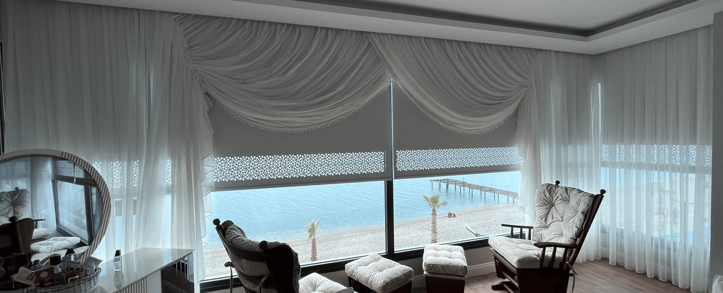 Ütü gerektirmeyen keten, örme, brode tül seçeneklerimizi,isteğe göre rustik veya dekoratif ray sistem ile tamamlayarak mekâna daha dekoratif ve şık bir görünüm kazandırıyoruz.
